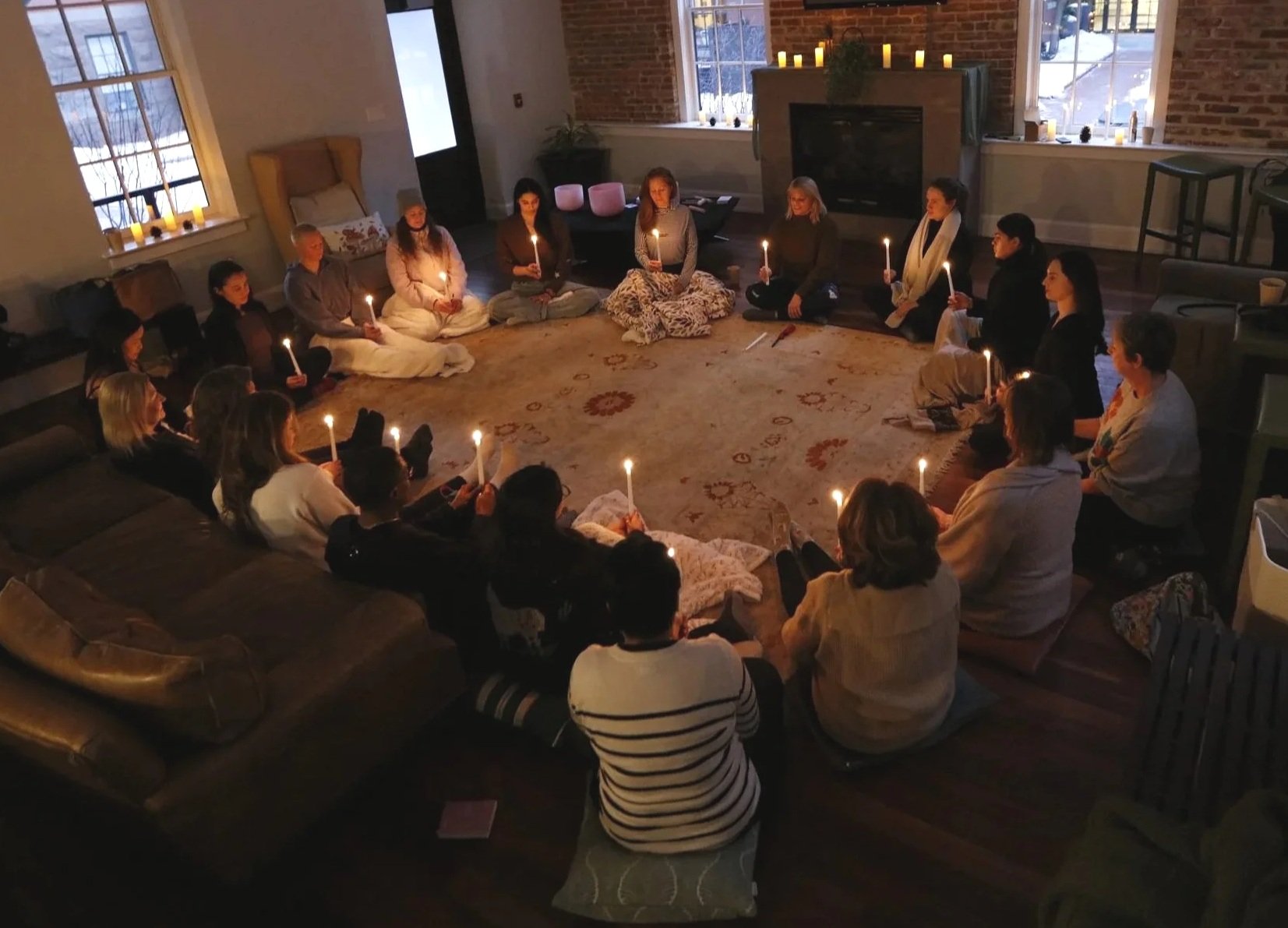 The room glowed with flickering candles, bowls of water, twinkling lights woven through greenery, and fabrics that softened the edges of the world outside. Cedar lingered in the air. Blankets and cushions lined the floor. The atmosphere was intimate, grounded, and deeply human.