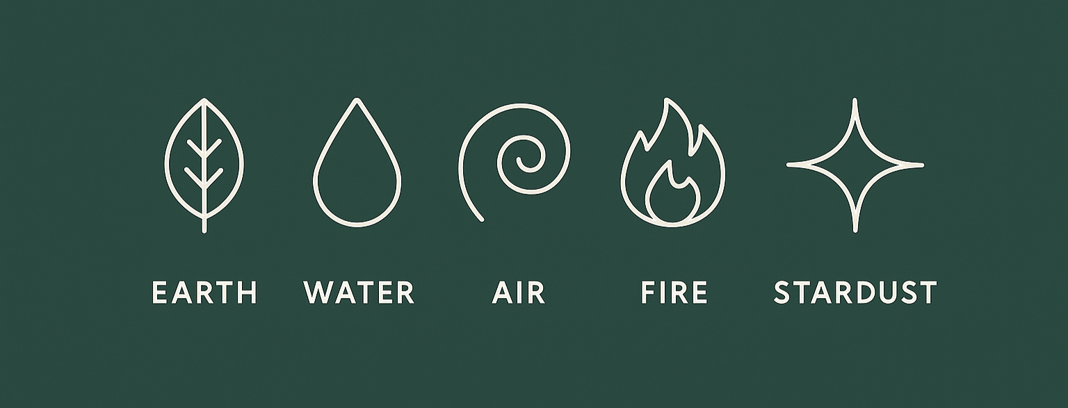 The Five Element Method uses the five elements of nature — Water, Air, Fire, Earth, and Stardust — as both metaphor and guide. Each element corresponds to a distinct phase of the human experience, and when sequenced in intentional order, these elements create a container that supports real nervous system restoration, clarity, and integration.